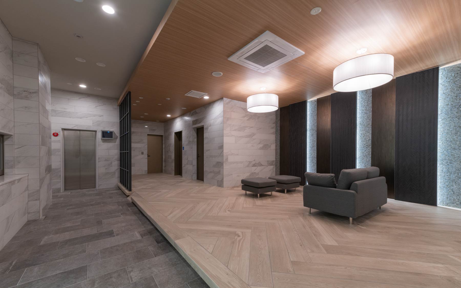 エントランスドアを入るとシティホテルのような風格を感じさせるエントランスホールが広がります。厳選されたアースカラーのタイルや天然石が彩る壁に、ヘリンボーン風のフロアデザインが織りなす落ち着きのある迎賓空間。ダウンライトの柔らかな光が住まう方を優しく迎え、くつろぎの時間へと誘います。